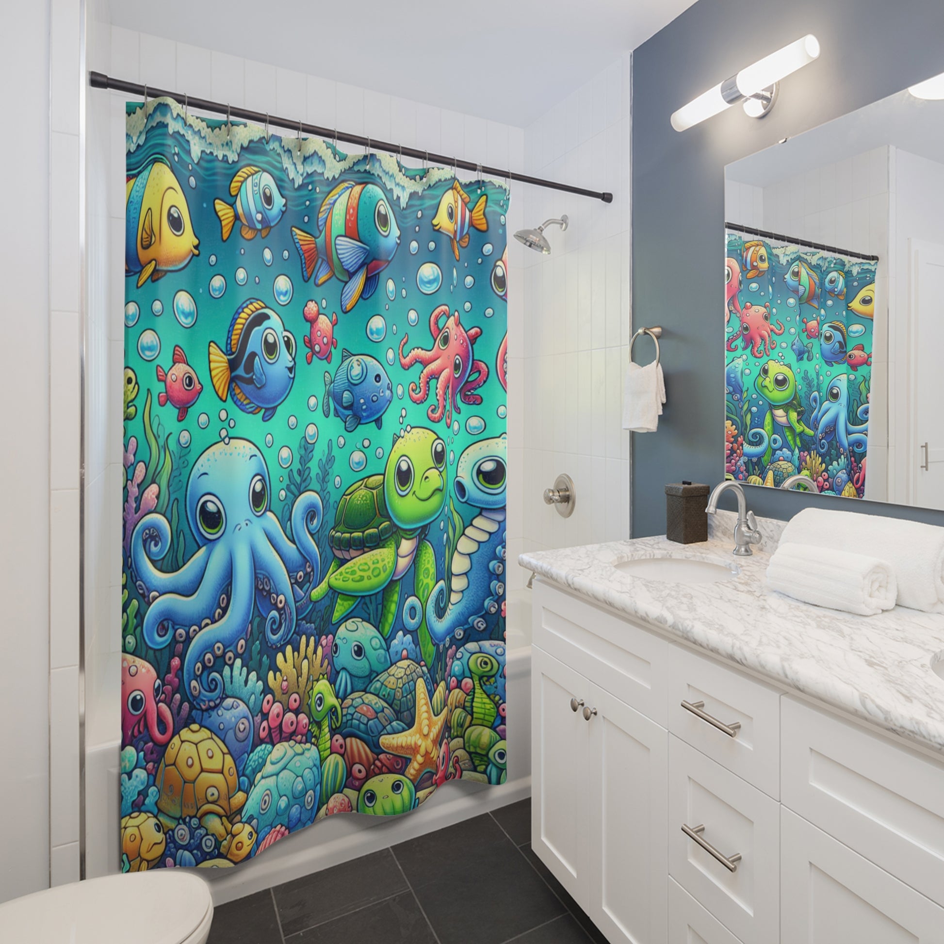 Create a serene ocean-inspired atmosphere in your bathroom with this Ocean adventure shower curtain. Made of 100% Polyester for durability and quick drying, this one-sided print curtain features 12 buttonholes for easy hook placement. Perfect for adults looking to add a touch of coastal charm to their space.