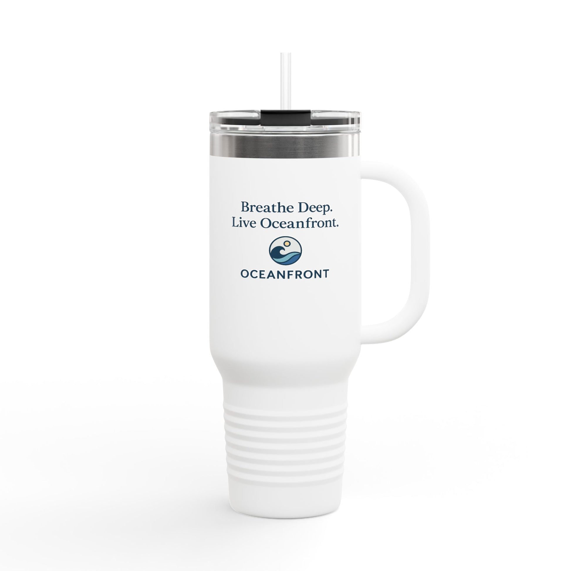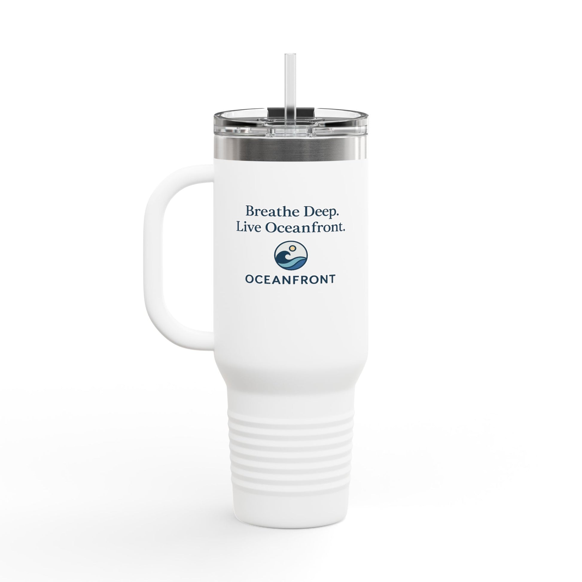 Oceanfront Insulated Travel Mug – “Breathe Deep. Live Oceanfront.” | Custom Name Option