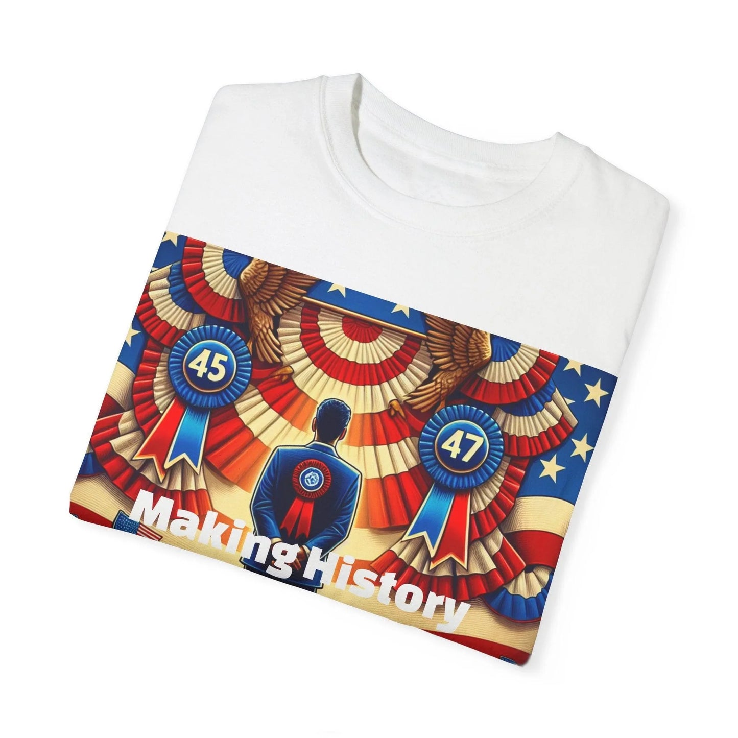Show your support for Trump as the 45th and 47th president with this unisex garment-dyed T-shirt. Perfect for political enthusiasts and supporters looking ahead to the 2024 election. The classic crew neckline and relaxed fit make it a versatile piece for casual or semi-formal settings.